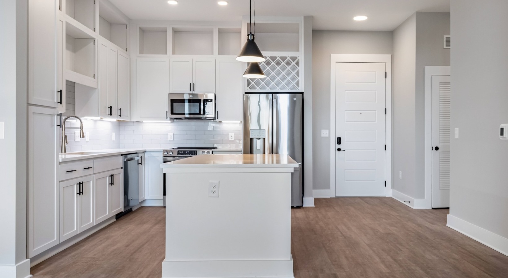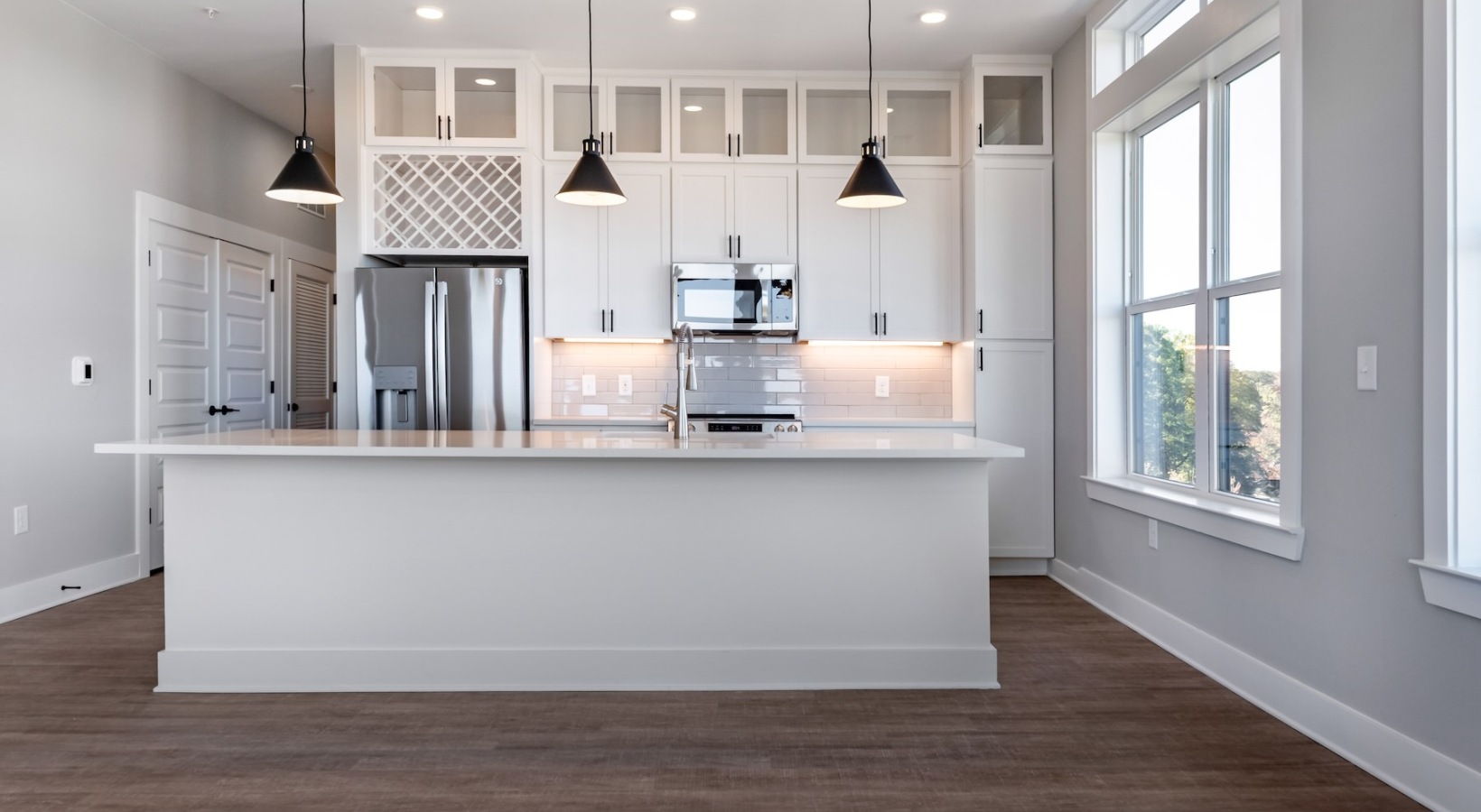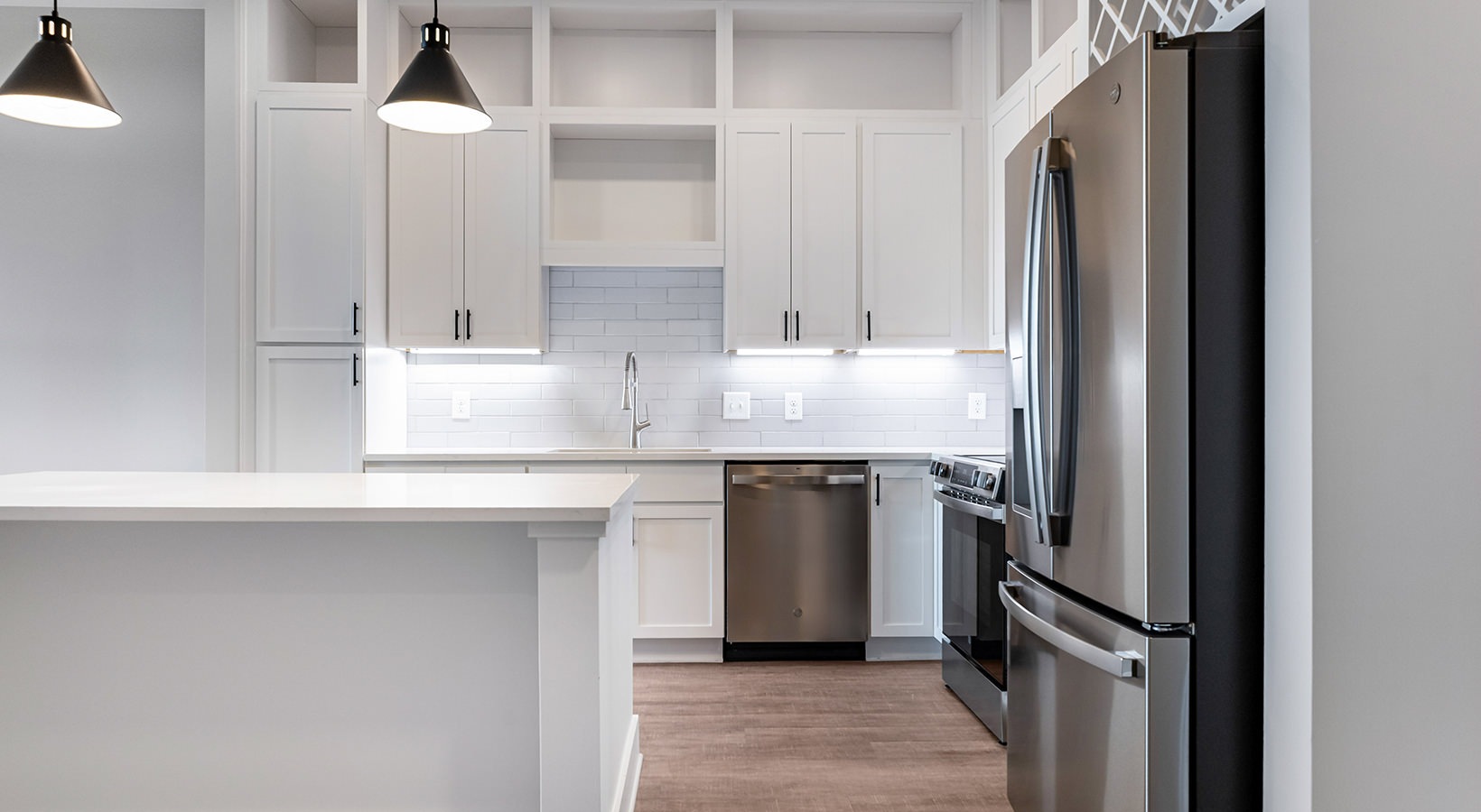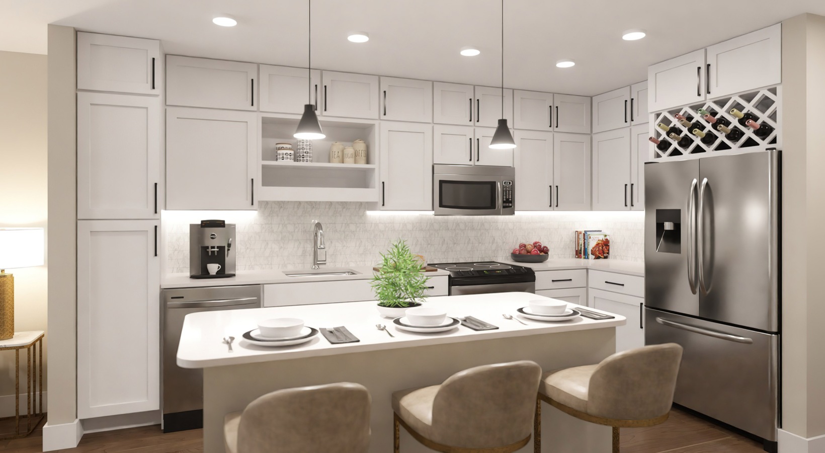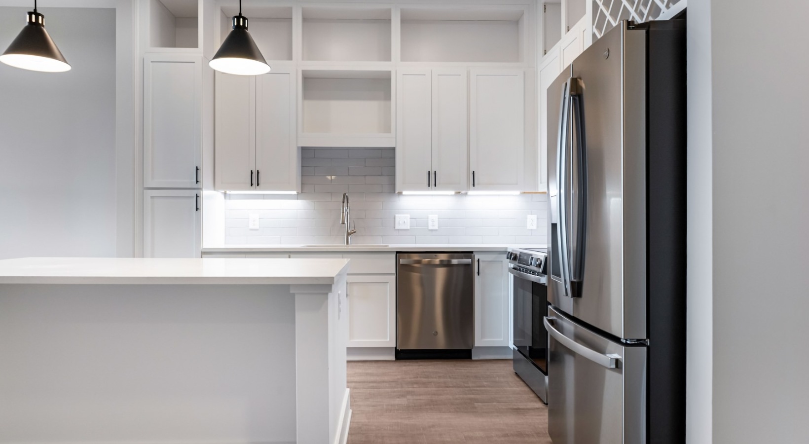 • a kitchen with white cabinets
