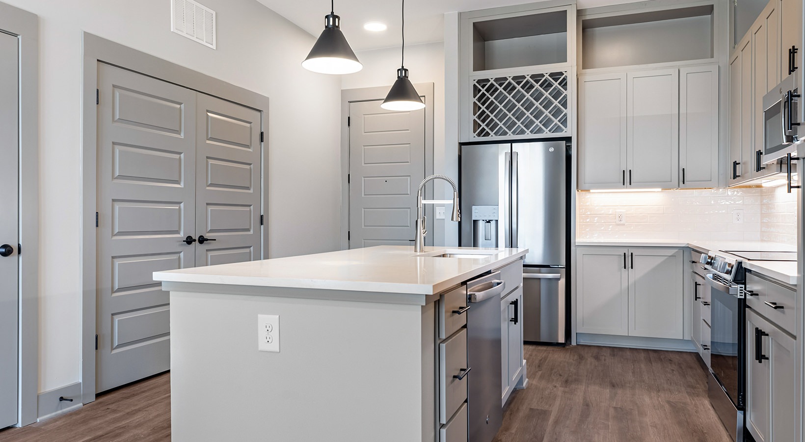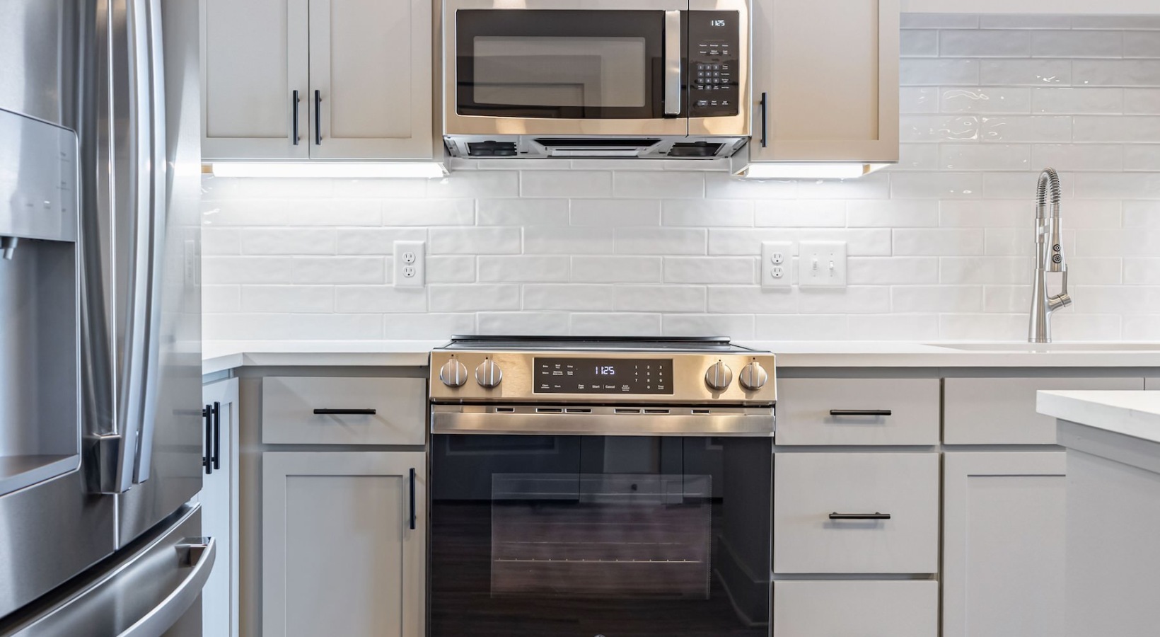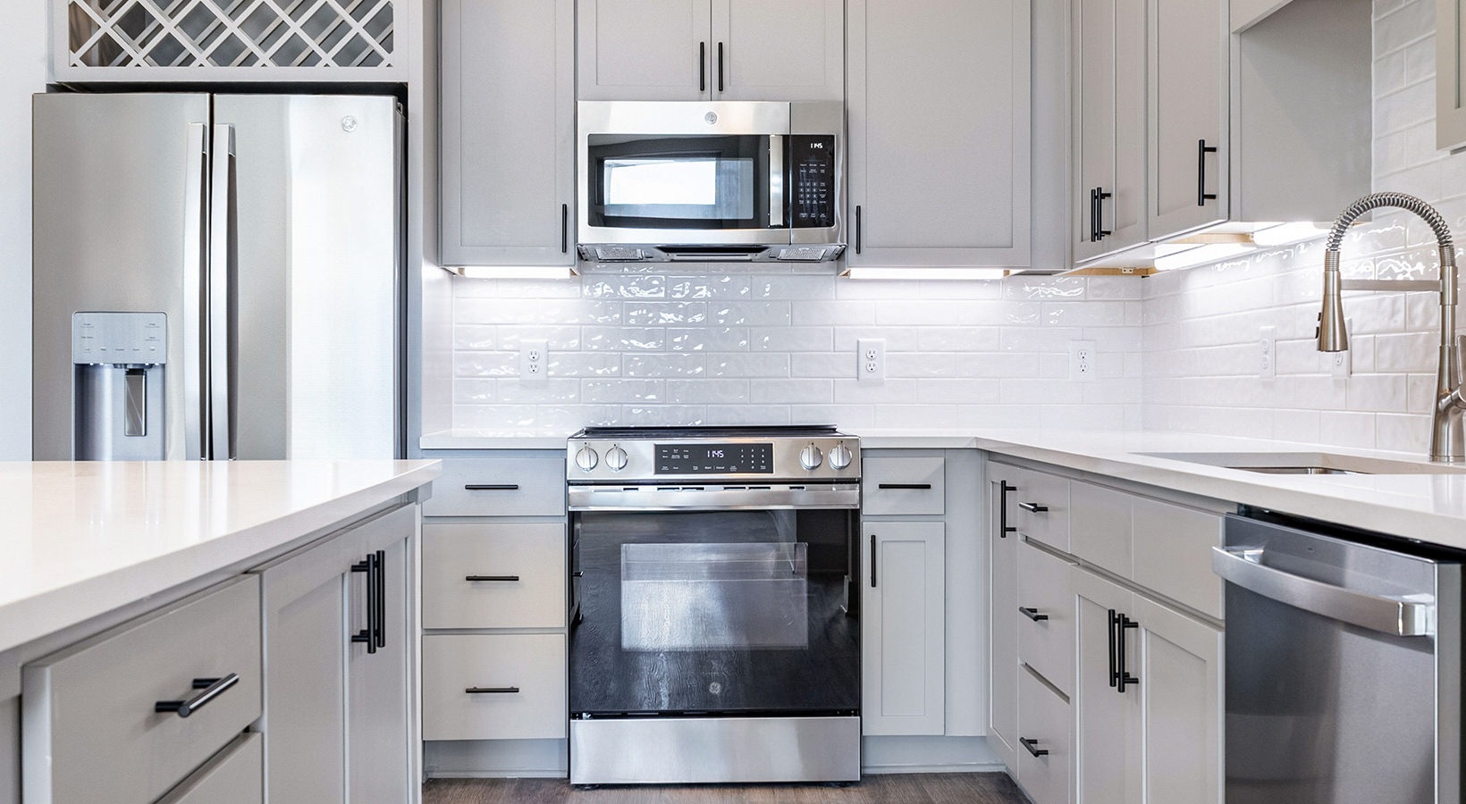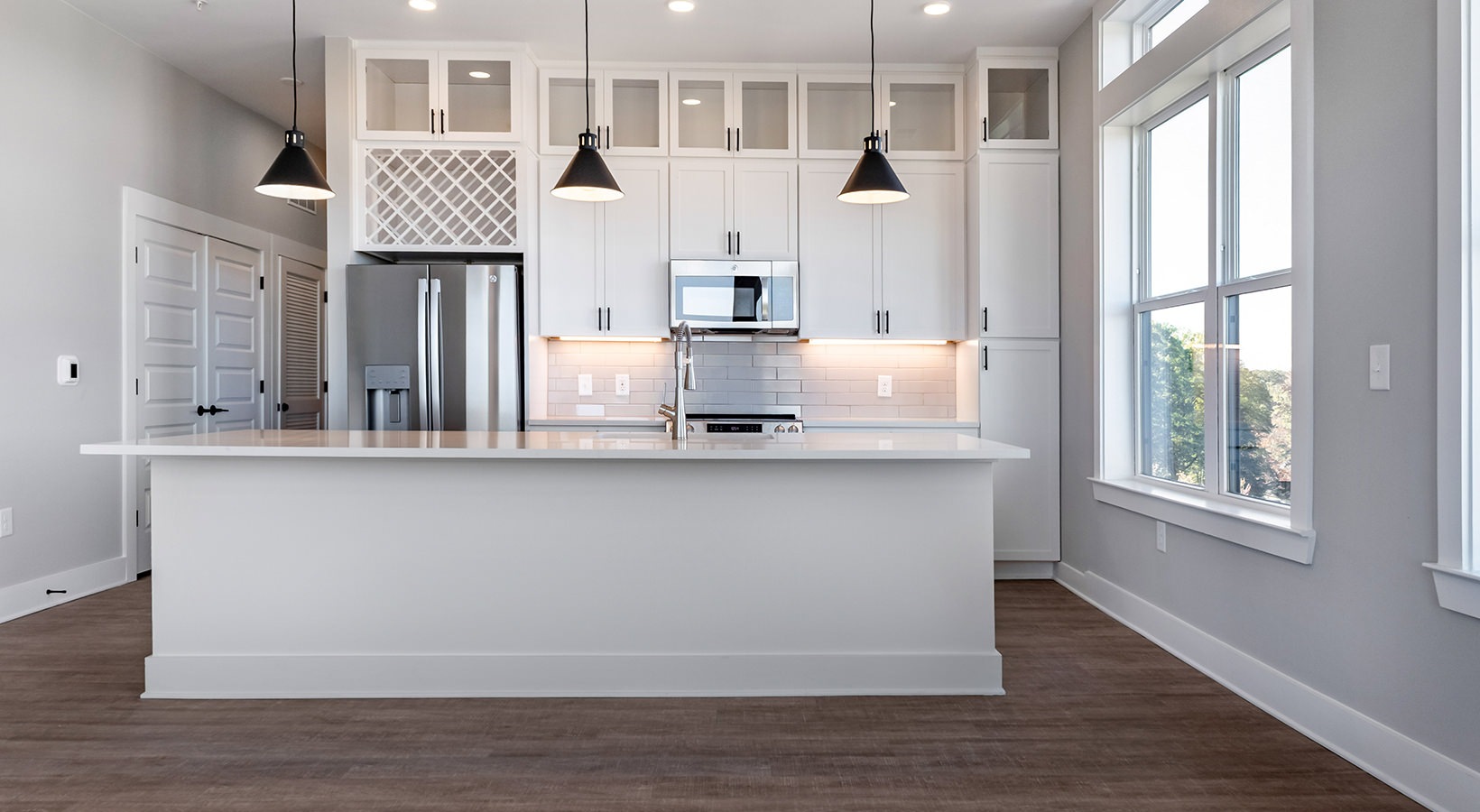 • a kitchen with white cabinets