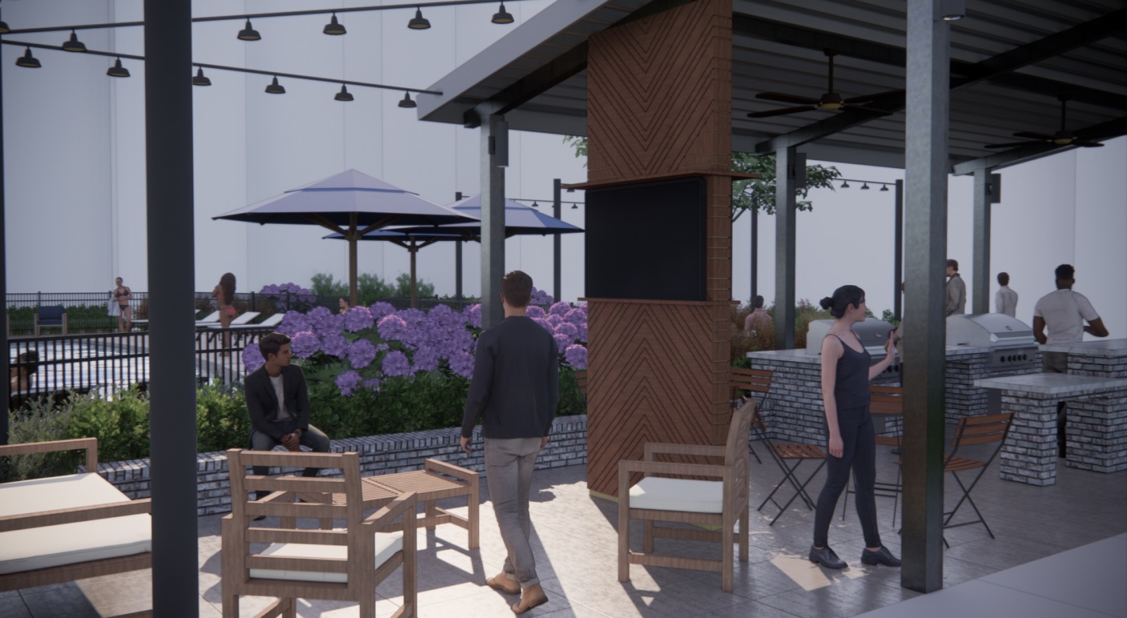 • a group of people sitting at a table outside with a grilling area